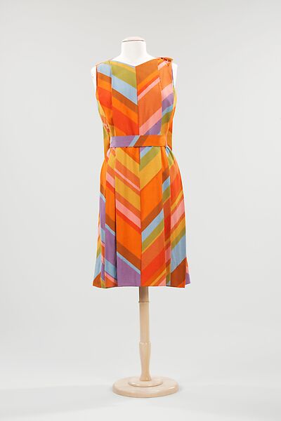 In the early 1960s, Jack Lenor Larson, the well-known textile designer, created a successful, but short-lived line of men's and women's clothing under the label "JL Arbiter." This dress reflects Larson's wit as a textile designer: rather than employ actual center front and center back seams, Larson lines up the chevron pattern in the textile so as to create trompe l'oeil seams, instead.