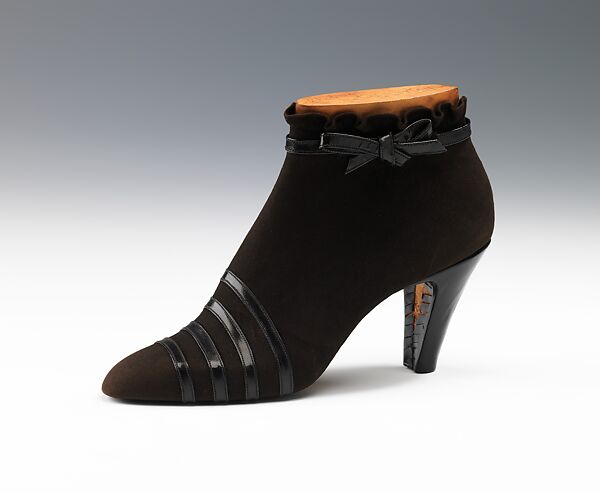 Elements of Victorian era styles were revived by designers in the late 1930s, including the taste for ankle boots. This design, although completely modern in detail, falls within that trend. The leather is deftly molded over the foot, and the fullness is arranged in neat ruffles around the ankle and belted with a patent leather strap. This configuration highlights the identity of the shoe prototype as an experiment in ideas rather than a functional design, as this boot contains no actual closure to allow insertion or removal of the foot.