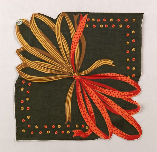 Handkerchiefs were still very much a part of a woman's wardrobe in the 1950s. This attractive printed example represents one of four Billy Weiss designs in the collection that were printed using a single screen (2009.300.3129, 2009.300.3131, and 2009.300.3132).