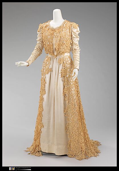 Worn while entertaining at home, teagowns express explicit femininity and represent a life of luxury. The lace of this teagown is of particular interest because of its overall design of interlinked flowers and scrolls. The high concentration of lace at the bodice adds visual interest as well as draws attention to the wearer's face. It is apparent that the silhouette of the dress makes historical references in the open robe effect of the lace overskirt and the Renaissance shirred sleeves. The combination of fine materials and historical characteristics create an air of romantic fantasy.