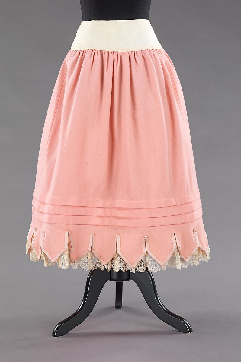 During the nineteenth century, petticoats served more than one purpose. In addition to supporting the outer skirt, they provided warmth as an extra layer and modesty by disguising the shape of the leg. Not only is the flannel petticoat featured here functional, constructed out of a heavier fabric for the winter months, it is also decorative. The pink color is unusual for petticoats at this time and gives the piece a sense of lingerie. It is also interesting to note that the crenellation at the borders follow the hemlines of the dresses popular during this period.