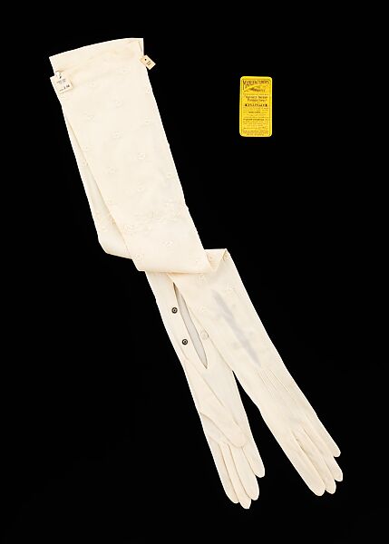 This pair of Kayser gloves is a nice representation of fine quality evening accessories of the period. They are unique because they are unworn and have all of their original tags from the retailer and manufacturer, including the price which indicates the late 19th-century cost of this type of luxury good. Julius Kayser & Co. was a manufacturer of women's accessories, primarily known for its lingerie. The retailer, Stern Brothers Department Stores, was originally on the Ladies Mile, a portion of Broadway between Eighth and Twenty-third streets, and was known for its luxury goods.