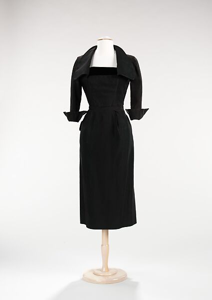 This cocktail dress represents a classic silhouette popularized in the nineteen-fifties. The portrait collar is extremely feminizing, framing the face and neck. The skirt is unique, as it is lightly draped at back, accented by a large patch pocket placed at the right back hip.