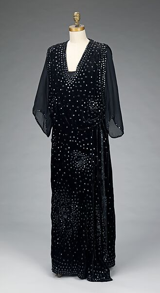 The dress is a transitional style from the style of the late teens into the tubular knee-length dresses of the 1920s. Although it exudes wealth, it is very different from the more traditional styles which had been offered by the House from its inception. The paillette design is remarkably executed and engaging.