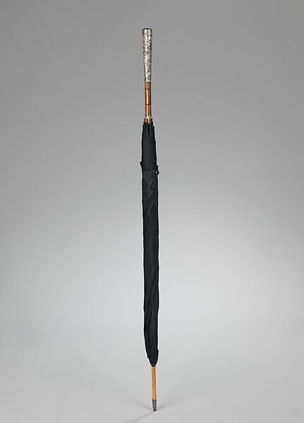 This umbrella is a well crafted and obviously expensive object. The workmanship for parasols and umbrellas of this quality was divided among various skilled craftsmen and manufacturers, as evidenced by the three makers' marks on this example. The provenance of this item is also noteworthy, as it was owned by a member of the Roosevelt family. Lest the umbrella be mislaid, the handle is engraved with the name and address of the owner.