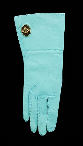 This glove shows Cashin's characteristic gold turn-lock which she incorporated in many of her glove designs as well as her purse designs for Coach.