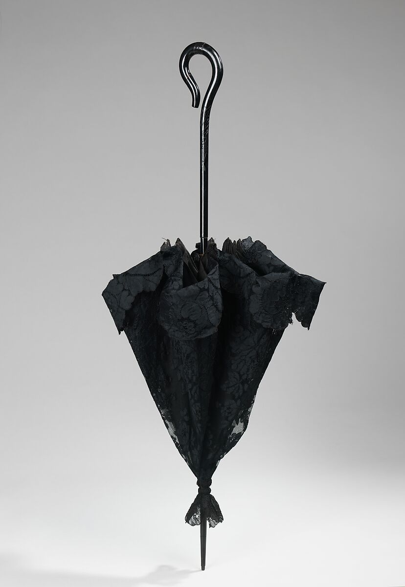 Seen here is a very elegant example of the lace parasols prevalent in the 1880s. The lacy sheer canopy is very flirtatious and the unusual shape of the handle is charming. This parasol would have been a very eye-catching accessory to any ladies' ensemble.
