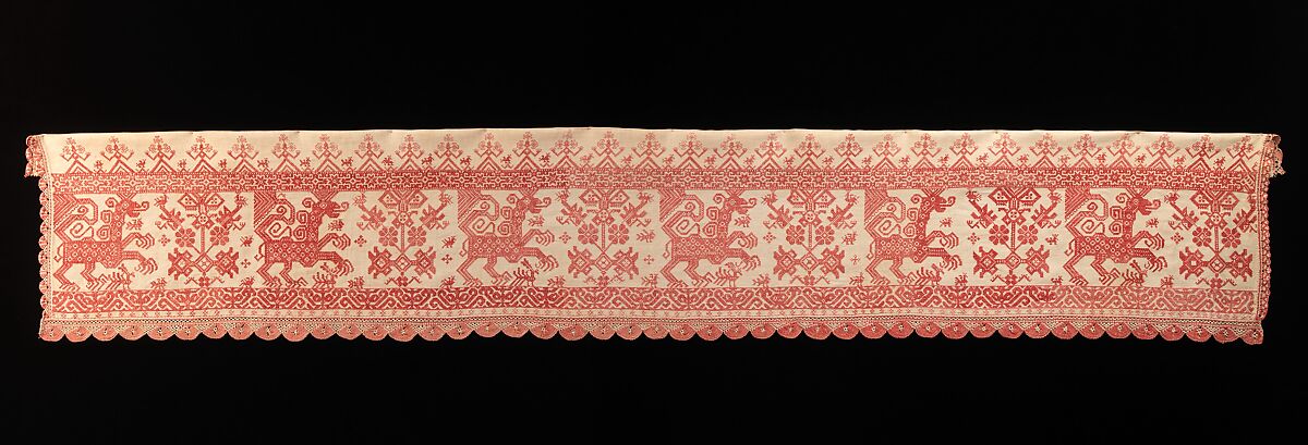 Depictions of the goddess are common in Russian embroidery, traditionally associated with fertility. The figure is commonly depicted with upraised arms and accompanied by birds and flowers. Birds are associated with goddess worship for their proximity to divine beings through their home in the sky. A smaller daughter or minor goddess often accompanies the great goddess in embroideries intended to represent reproductive fertility. This language of visual motifs originated in Pagan times and continued to be used in embroidery after the Christianization of Russia. Later depictions of the goddess are very stylized, resembling a plant or tree of life. The large plant motif in this example is likely the goddess, and the border made up of minor goddesses. The geometric design of the borders are an interesting contrast to the sinuous lines of the rampant lions. This type of juxtaposition is characteristic of Russian folk vocabulary.
