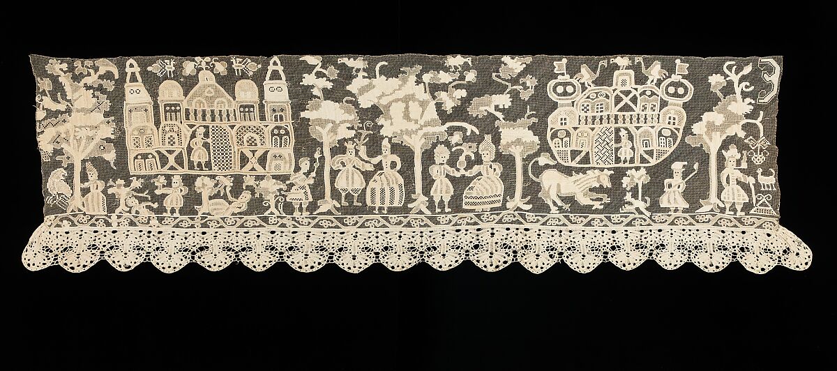 This beautiful example of folk embroidery seems to incorporate a narrative, including two interesting building structures. The amount of detail in the piece is striking, particularly in the costume, which appears to be in the 17th-century style.