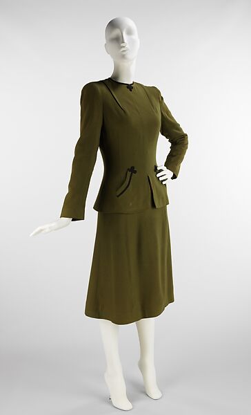 In her own notes, this suit is repeatedly referenced as the "Fencer Suit." Throughout her career, she repeated this silhouette, making it one of her classics. The pockets, trimmed with braid, are actually inspired by the Hussar uniforms she saw in Vienna when visiting as a child. Remembering that detail, she interpreted it into her designs. The BMA costume archives have sketches as well as editorial promoting this suit, an obvious success with her female clientele.