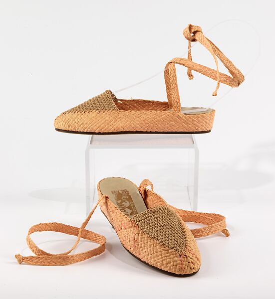 The local Florentine straw manufacturing industry inspired Ferragamo to utilize the material for shoe uppers when he returned to Italy in the late 1920s. Raffia soon became a favored material for the designer, joined by a synthetic raffia called "pontova" in the later 1930s. Ferragamo employed various techniques for his straw and raffia work, including weaving, braiding, crochet, and embroidery. Here, the woven raffia is complimented by crocheted cotton cord, amplifying the nautical summer effect of the shoes.