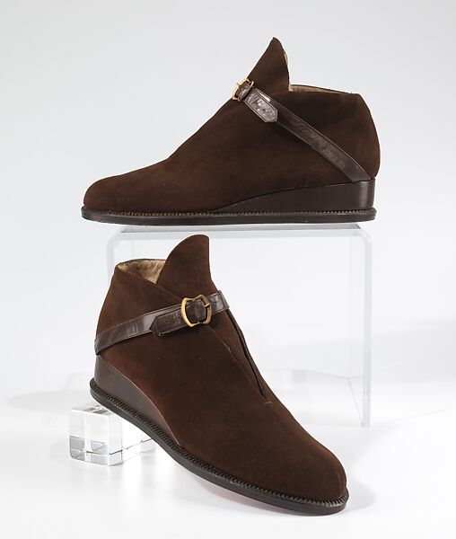 Although less important for other designers, Ferragamo often included boots and boot-like shoes in his collections. This pair of shoes has a particularly beautiful cut, with careful attention to the lines of the strap and of the topline, which echoes the line of the wedge heel. Ferragamo was a major figure in the development of the wedge heel in the 1930s, and frequently included it his designs. On this example, the combination of a wede heel and a flat welted sole is particularly unusual.