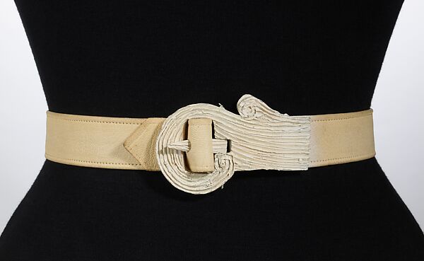 Schiaparelli often used her accessories, particularly belts, as avenues of expression for her Surrealist ideals. Buckles, clasps, decorations and belts themselves were made of unusual materials, such as plastic and plaster, and in quirky shapes that could elicit a viewer’s double-take. To pair such an off-beat accessory with a couture garment was just the kind of humorous irony Schiaparelli enjoyed incorporating into her work.