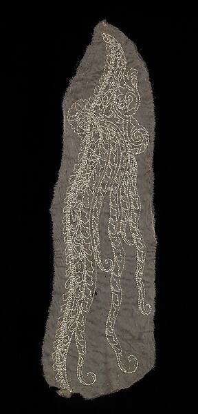 This object is from a collection of sample embroideries, which was originally owned by Morris de Camp Crawford, editor of Women's Wear Daily, who collected objects which told the story of fashion and fabric history. Included in this collection was a group of textiles which illustrated what American and French designers and manufacturers were using. According to Crawford's book The Ways of Fashion, the work of Polish artist Sarah Lipska (1882-1973) was represented in this collection. Lipska is an enigmatic figure, who is known to have worked with Leon Bakst as a set and costume designer for the Ballets Russes, and later in the 1920s as a fashion designer in Paris at 4 rue Belloni, and finally as a sculptor. Extant examples of her work are rare. Although only a few pieces in the Brooklyn Museum collection bear a label or a signature, others bear hallmarks of her work, such as a distinctive form of whip stitching on appliqué work, unusual abstract motifs, and Cubist-inspired patterns.