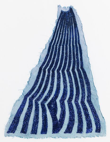 This object is from a collection of sample embroideries, which was originally owned by Morris de Camp Crawford, editor of Women's Wear Daily, who collected objects which told the story of fashion and fabric history. Included in this collection was a group of textiles which illustrated what American and French designers and manufacturers were using. According to Crawford's book The Ways of Fashion, the work of Polish artist Sarah Lipska (1882-1973) was represented in this collection. Lipska is an enigmatic figure, who is known to have worked with Leon Bakst as a set and costume designer for the Ballets Russes, and later in the 1920s as a fashion designer in Paris at 4 rue Belloni, and finally as a sculptor. Extant examples of her work are rare. Although only a few pieces in the Brooklyn Museum collection bear a label or a signature, others bear hallmarks of her work, such as a distinctive form of whip stitching on appliqué work, unusual abstract motifs, and Cubist-inspired patterns.