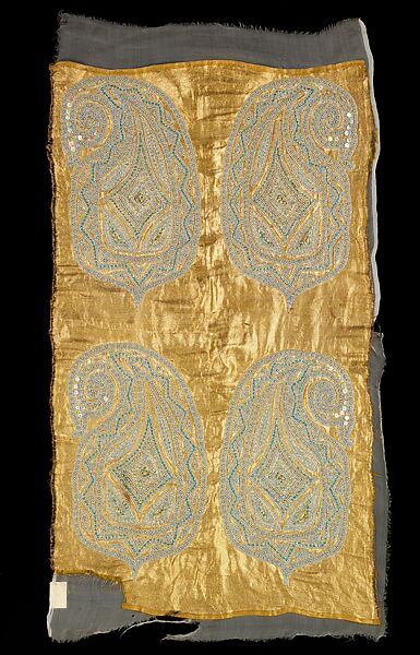 The boteh, or paisley, motif has been used throughout fashion history in various forms. Its use in this finely embroidered example reflects the interest in exoticism and non-Western cultures of the 1920s. A variety of bead shapes and colors are used to create texture and the base fabric, lamé, adds an additional level of dimension.
