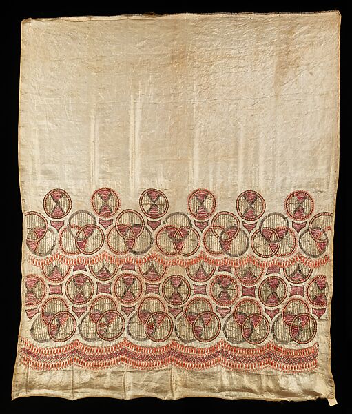 This object is from a collection of sample embroideries, which was originally owned by Morris de Camp Crawford, editor of Women's Wear Daily, who collected objects which told the story of fashion and fabric history. Included in this collection was a group of textiles which illustrated what American and French designers and manufacturers were using. According to Crawford's book The Ways of Fashion, the work of Polish artist Sarah Lipska (1882-1973) was represented in this collection. Lipska is an enigmatic figure, who is known to have worked with Leon Bakst as a set and costume designer for the Ballets Russes, and later in the 1920s as a fashion designer in Paris at 4 rue Belloni, and finally as a sculptor. Extant examples of her work are rare. Although only a few pieces in the Brooklyn Museum collection bear a label or a signature, others bear hallmarks of her work, such as a distinctive form of whip stitching on appliqué work, unusual abstract motifs, and Cubist-inspired patterns.