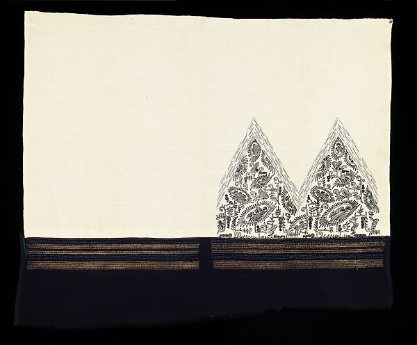An example of a working relationship with a well-known company, this fabric was executed by Rodier, a well-known Paris textile manufacturer that worked with many couturiers, such as Poiret and Chanel, while the embroidery itself was designed and possibly executed by Sarah Lipska. She expresses her whimsical design sense in the unusual floral forms enclosed in bold triangles, evoking a fanciful meadow. The opposing navy and white sections are graphically distinctive, and the overall effect is highly fashionable.
