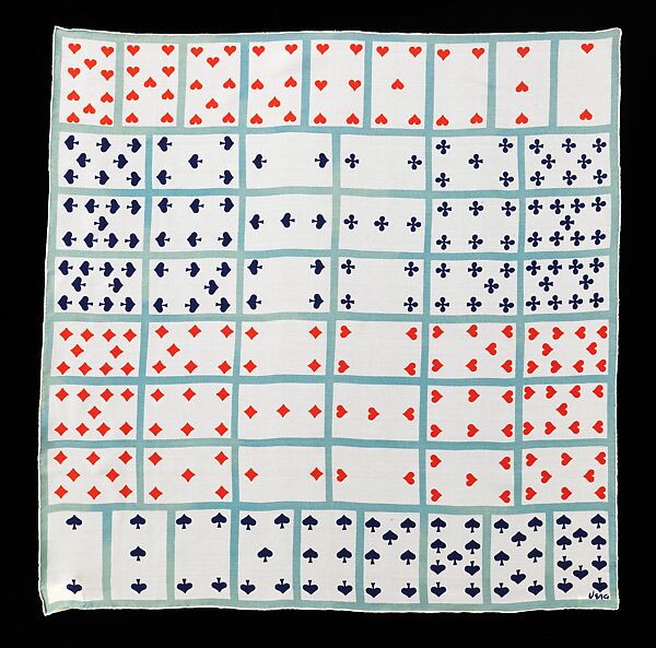 During the 1950s, bridge became a popular card game, mainly because new methods for scoring and playing were developed. The clever design of this scarf reflects the favorite American past time in a visually pleasing way. The Brooklyn Museum also has four other examples of this design in different color ways.
