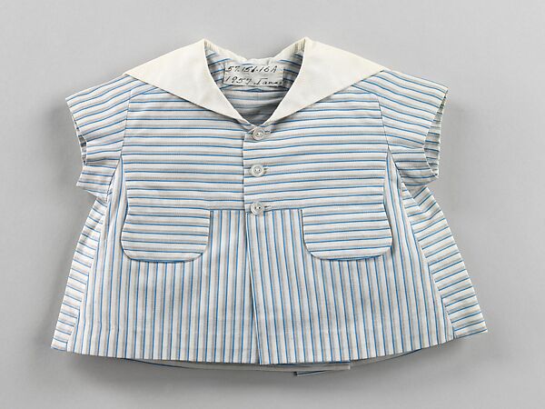 James debuted his line of infants’ wear at his Salon in October 1956, modelled by his 8-month-old son, Charles Brega Haweis James, and a coterie of small, red, full-bellied mannequins. The clothes he showed were marked by graceful shaping, precise cut, and refined seaming, as seen in this infant’s jacket. It displays an unusually complex and inventive cut for a child’s garment, with sleeves cut in one with the back yoke, two pendants extending from the front yoke to imitate pockets, and a pleated back vent for ease of movement. The sailor collar and the stripes’ varied directions add visual interest to this simple, practical style. Such attention to form, fit and functionality reflect James’s pursuit of perfection in all facets of his work.