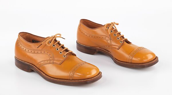Throughout the 20th century, the general cut of men's shoes has remained fairly consistent, while periodic variations center around detail, material, and proportion. The two basic patterns for laced shoes are the oxford or "closed tab", where the lacing tabs are stitched under the vamp, and the blucher or "open tab", where the lacing tabs are stitched on top of the vamp. These two pairs of shoes follow the classic cuts, but are distinguished by the slightly exaggerated details and somewhat unusual color. Coming from a group of samples retained by the Hurd Shoe Company, the shoes are said to date from the 1940s, although the wide, shallow toe shape is more typical of styles around 1930.
