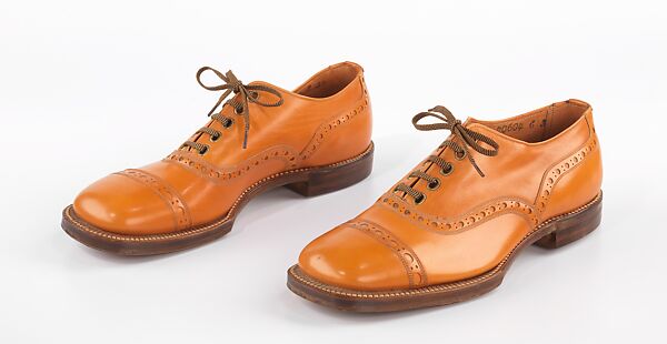 Throughout the 20th century, the general cut of men's shoes has remained fairly consistent, while periodic variations center around detail, material, and proportion. The two basic patterns for laced shoes are the oxford or "closed tab", where the lacing tabs are stitched under the vamp, and the blucher or "open tab", where the lacing tabs are stitched on top of the vamp. These two pairs of shoes follow the classic cuts, but are distinguished by the slightly exaggerated details and somewhat unusual color. Coming from a group of samples retained by the Hurd Shoe Company, the shoes are said to date from the 1940s, although the wide, shallow toe shape is more typical of styles around 1930.