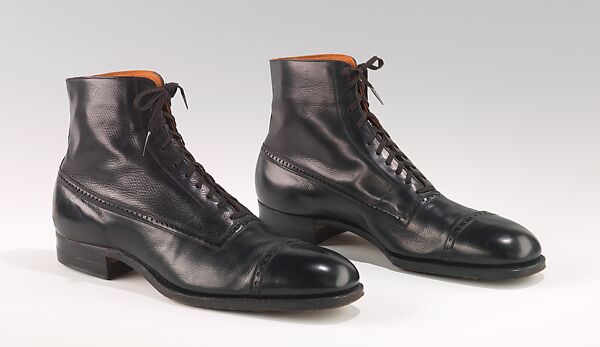Through most of the 19th and 20th centuries, men’s fashion, especially footwear, has tended to be more staid and less subject to rapid or extreme fluctuations than has women’s. Traditional views of masculinity discourage excessive interest in fashion, men's styles evolve more slowly, and the male wardrobe need not be extensive to be complete. Men therefore tend to have fewer clothes and wear them for a longer period, making shoes that survive in excellent condition particularly scarce. This pair of classic men’s early 20th century boots was saved as a manufacturer’s sample, so remains in original unworn condition. Of particular note on these boots in the interesting variation in perforation sizes and the square throat line.