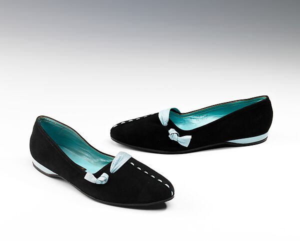 This pair of flats shows the current trend in resort wear for black suede paired with pastel kid trim. The shoes were also produced with alternate trim colors of white, pale pink, beige, and pale yellow.