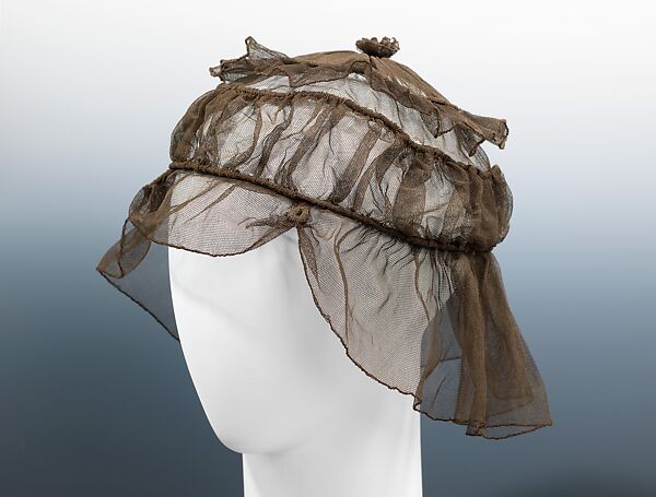 In the 1920s, close fitting caps became extremely popular for evening wear. Producing this hat near the end of her fifty-year career as a renowned milliner, Caroline Reboux was well versed in historical styles. She presents here an unusual and intriguing reinterpretation of the calash, an oversized collapsible bonnet of the late 18th and early 19th c. consisting of a fabric body shirred onto hoops, transforming it into a soft and close-fitting evening cap. The self-fabric ruffle historically found trimming the edges of a calash has been reconfigured as a playful frill and top knot on the crown. The designer has further modernized the form by incorporating the contemporary element of an irregular turned-down brim.
