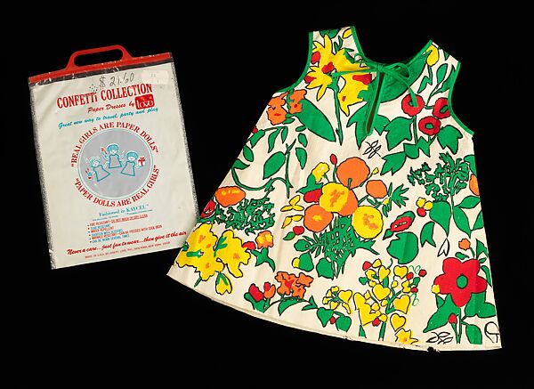 The paper dress craze was short-lived in the late 1960s. A fashionable trend, they were also made for promotional purposes and served as a sartorial representation of the throw-away ethos of the period. This example, created by prominent children's designer Joseph Love, has a particularly exuberant, cheerful and artistic pattern, which is child-like but also sophisticated.