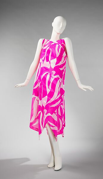 Sylvia Pedlar was a renowned American lingerie designer in the mid-20th century. She regularly updated historic forms to create her luxurious nightwear and lingerie. The toga form was one of her earliest and most outstanding designs which she continued to use and change throughout her design career. This example is very avant garde not only in its simplicity of cut, but in its bright, almost psychedelic patterning which presages the era of the 1960s.