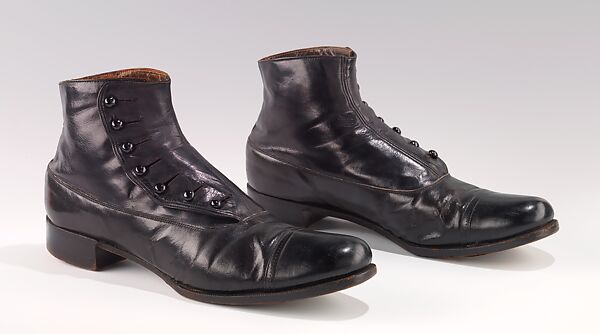 The "high button shoe", as exemplified here, is a familiar symbol of the apparel of earlier generations. The button closure had come in and out of style since its initial adoption in the 1830s, but was particularly dominant in the early 1910s. In the 1920s the button boot persisted for dressy wear, but was increasingly considered somewhat old fashioned, and the style had died out by the 1930s. This fine example of men’s button boots includes features typical of the dominant period. They are cut in the Balmoral style with a whole (one-piece) vamp. The leather of the buttoned top is in a contrasting matte finish, producing a spat effect. While a pointed toecap was often seen on earlier boots, by 1910 the straight toecap was universal. These boots bear the label of Burt & Co., a store on Fulton St., Brooklyn.