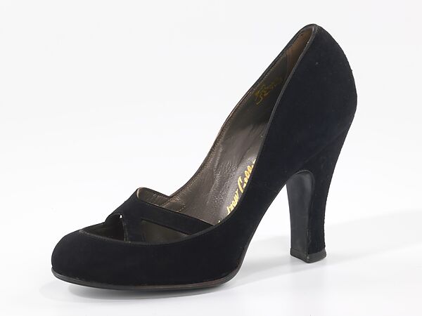 This pump is an early example of Levine's work, produced by the high-end Brooklyn manufacturer Andrew Geller. The shape, with a very high arch and round toe, was called the "baby-doll" style at the time. The "shelled-out" (low cut) upper and cutaway vamp with strap insertions was a strong design trend at the time, and Levine attributed her low-cut, sexy designs with the early success of her company Herbert Levine, Inc.