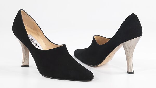 Bernard Figueroa, who designed his own line of shoes from 1993 to 2003, is noted for his sophisticated designs employing modern, inventive cuts paired with quirky surrealist sculptured heels. Figueroa was an important figure in the renaissance of the creative interpretation of form which has enlivened shoe design since the early 1990s. The deconstructivist quality of the distorted heel of this shoe can be seen as a manifestation of that trend.