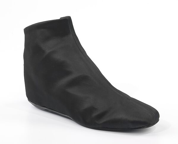 This design presents and intriguing nexus of old and new. Short ankle boots had been worn as a slipper or après-ski style through the 1950s, but here Levine updates the form as a progressive dressy style, suitable for wear with evening trousers. While Levine is not known for historical references in her work, this design closely resembles early 19th century side-laced ankle boots.