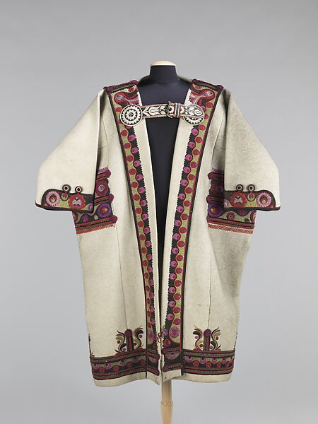 The Hungarian szür is derived from mantles over 2500 years old, and continued to be worn into the early 20th century. The garment was worn by shepherds mostly, providing protection from the harsh elements. Their thick wool felt was protective against cold and wet, and the long collars were adorned with roundels at the lower corners that could be connected to form a hood. Generally knee to mid-calf length, they were heavily adorned with embroidery and appliqués specific to their locality. The szür was usually worn draped over the shoulders, with the sleeves hanging loose. It was a much-coveted object, and so costly that many men resorted to thievery to afford one. This particular szür's embroidery is of the Kúnság-type, created in Szentistván, Borsad County in Upper Hungary.