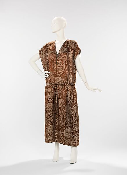 This evening dress is a rare example of the work of Vitaldi Babani. The prevalent interest in Orientalism at the time can be seen in the garment's caftan styling and floral and leaf patterning; both of which are influenced by Middle East designs.