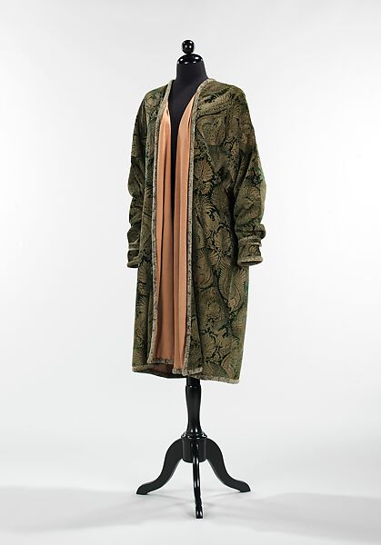 Quoting Lucchese velvets, here Fortuny uses the prized Italian Renaissance textile form for a visually stunning evening coat, juxtaposing heavy gold stenciling against a luxe bottle green ground. The tapered sleeves and the soft gray-green velvet rouleau at the wrists bespeak classic Fortuny forms.