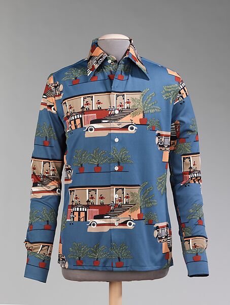 Menswear at this time was colorful and body-conscious and designs often drew upon nostalgic themes. This shirt, with its close fit and bright colors is enlivened with images of the '21 Club', the notorious restaurant-cum-speakeasy that epitomized New York glamour from Prohibition to well beyond the post-WWII years.