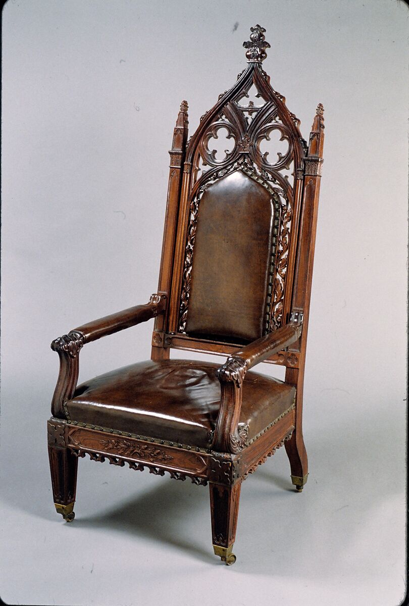 Although not marked, this grand Gothic Revival armchair carved in rosewood can be documented to the early career of Thomas Brooks, an important Brooklyn cabinetmaker who supplied the New York market throughout the mid-nineteenth century. Gothic Revival furniture of this quality is rare, and this recent gift is the only piece by Brooks in the collection. Notable is the tall back that culminates in a pointed arch, surmounted by a boldly carved finial; pierce-carved foliate vines studded with acorns lead the eye to finely crafted Gothic tracery enclosed by clustered colonnettes.