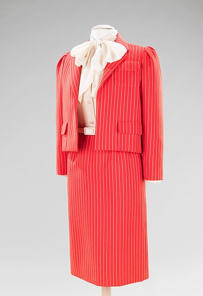 Nancy Reagan favored the designs of Bill Blass while she was First Lady. This suit, in her signature red color, was worn for two events in 1981: the White House's annual Easter Egg Roll and a state visit by Prime Minister Suzuki of Japan.