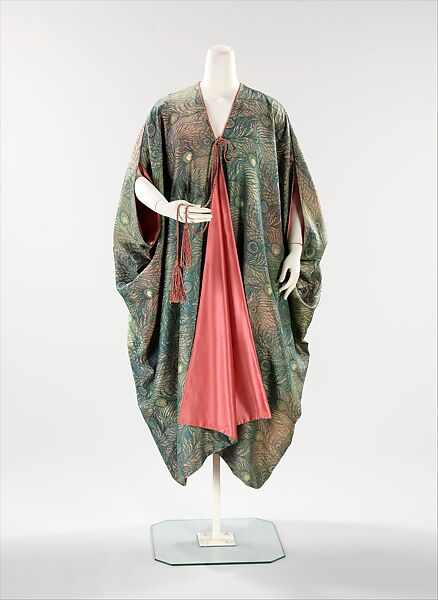 Liberty & Co. founded in London in 1875 by Arthur Lasenby Liberty (1843-1917) as a retailer specializing in goods from the Orient and Far East, became strongly influenced by the Aesthetic Movement, and later, was associated with the Art Nouveau style. The retailer, an advocate of affordable and distinctive design, not only imported items, but also tapped English designers to produce furniture, household goods, and fine textiles. Arthur Silver produced Liberty's iconic peacock textile 'Hera' in the late 19th century. The signature motif refers to the bird sacred to the eponymous Greek goddess and is used to dramatic effect in this evening coat based upon the Middle Eastern caftan. The changeante fabric mirrors the iridescence of peacock feathers.
