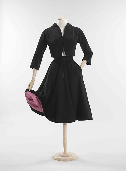 This ensemble, made from the un-expected plush zibeline, is a flirtatious example of a 1950 suit. The jacket's inventive cut creates a rounded voluminous front and forms a cowl-like stand away neck in the back. While the more traditional round skirt has common Cashin touches such as large rounded side pockets, with seam lines exposed, and pink lining.