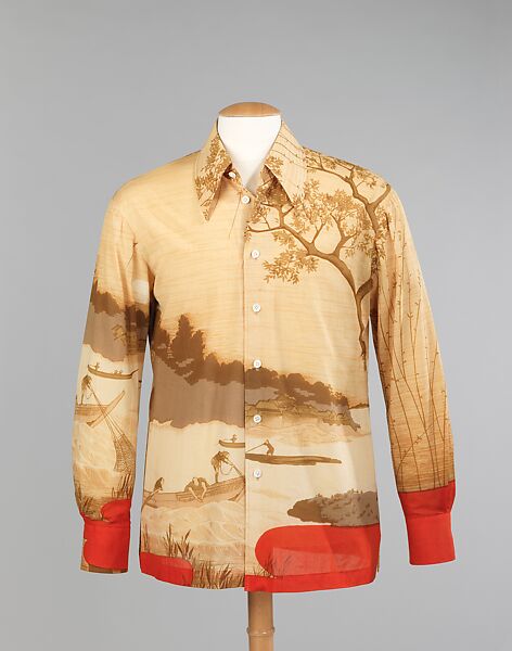 The Japanese designer Hanae Mori is well known for pairing Japanese details with Western garment forms. The unusual landscape patterning on this shirt shows thoughtful design placement. Bergdorf Goodman, the retailer, is a supplier of high-end goods.