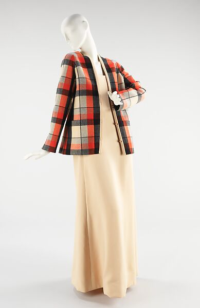 This evening ensemble is an interesting juxtaposition in the use of blanket plaid, traditionally for casual wear, for evening wear. The plaids of the jacket are meticulously matched, showing the amount of detail taken while creating this garment, and the cream wool sheath, though simple in silhouette, is finely finished. The combination of both pieces, complement each other, making it a handsome evening ensemble.