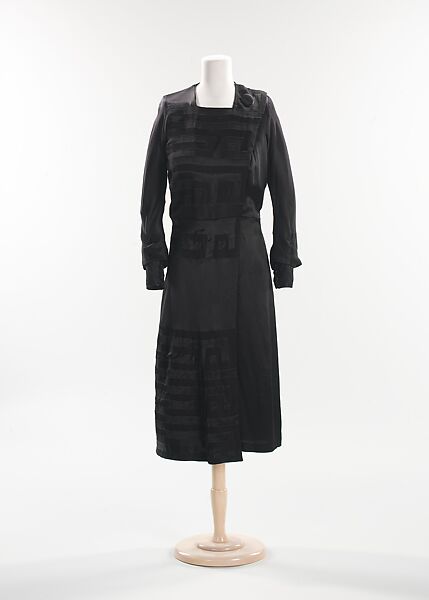 The geometric Art Deco pattern on this cocktail dress is created by using the different fabric sides. A good example of the work produced at Henri Bendel at the time, it was probably created in the store's custom salon, possibly by Bendel, himself. The eponymous store was founded in New York City in 1895.