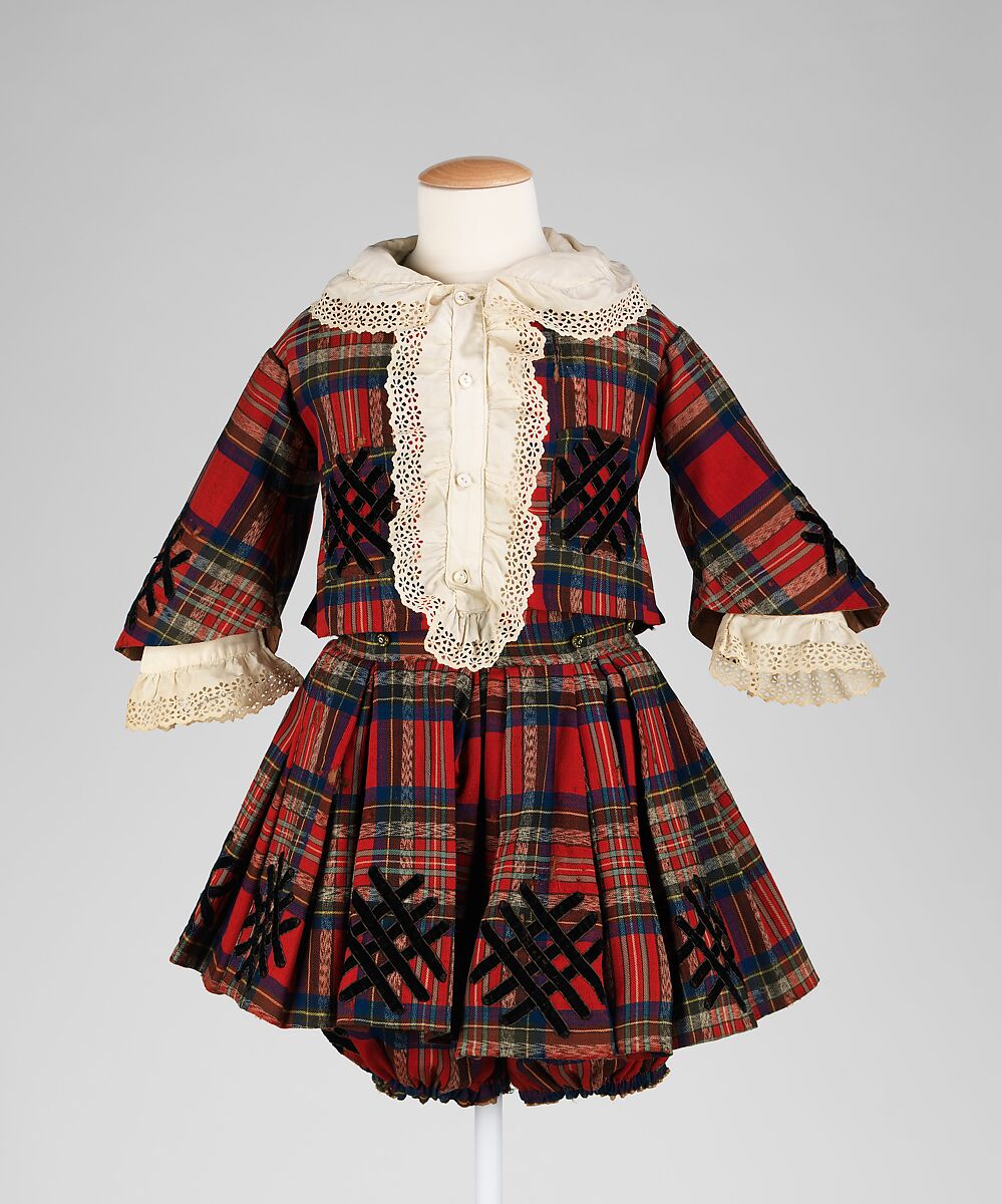 The boy's suit seen here mirrors the fashion for plaid which was prevalent at that time, made popular by Queen Victoria and Prince Albert. A properly dressed boy would have worn an ensemble such as this. Appropriate for the period, knickers accompanied boy's ensembles with skirts as an alternative to girl's pantalettes.