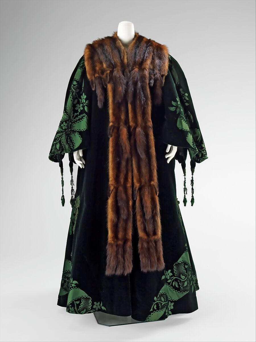 This is an iconic coat of the House of Worth. The construction is meant to emphasize the textile in the most dramatic way and would have been custom made for the House. The House of Worth was founded with an interest in heavily supporting the textile industry through vast amounts of elaborate textiles. This is an example of how that mission continued on through the design's of Charles Frederick Worth's son.
