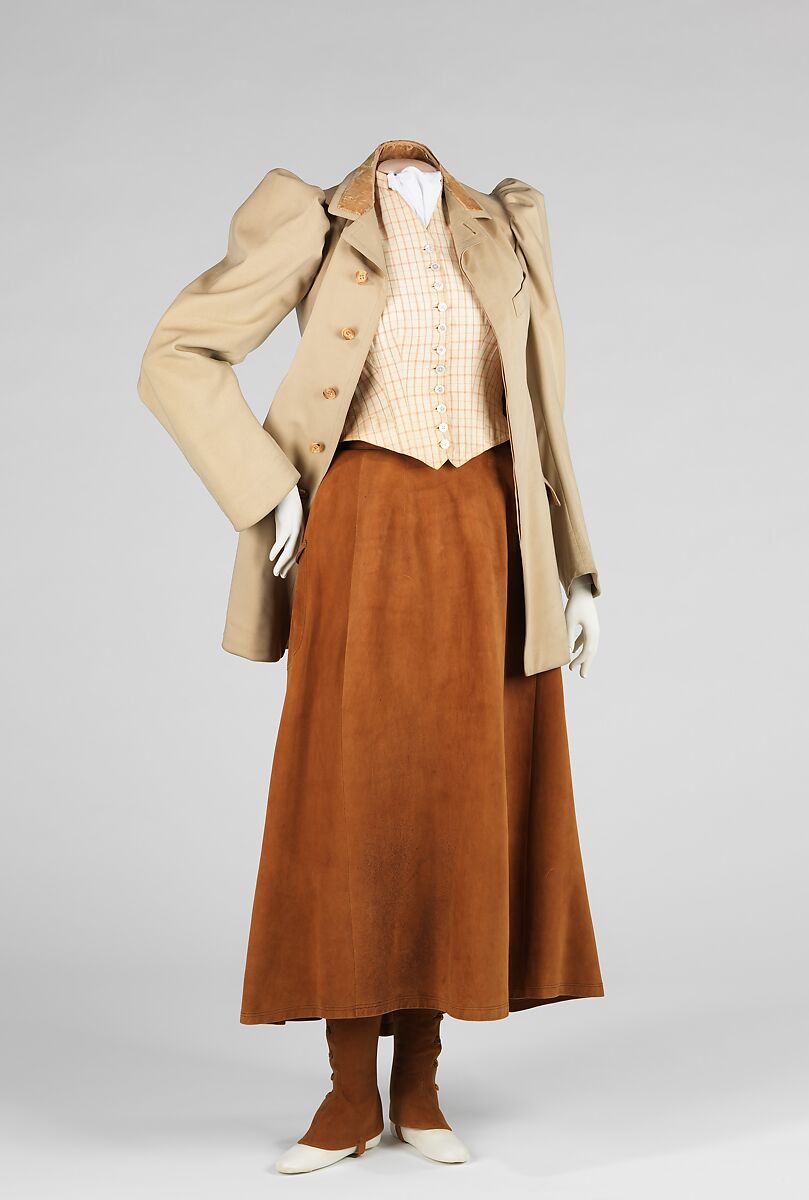 This object is part of a group of riding clothes which belonged to Eleanor Hewitt. Hewitt, an accomplished horsewoman, enjoyed riding at the Hewitt family home, Ringwood Manor, in northern New Jersey. "Miss Nelly," as Eleanor was known, occasionally wore menswear-inspired garments in her daily wardrobe, as well as for sporting activities. The concealed button placket gives this jacket a clean line. The leg-of-mutton sleeves and collar faced with velvet are details seen the jackets of walking suits of the same period. The tailoring of riding clothes translated into other tailored garments for women in the late 19th and early 20th centuries.