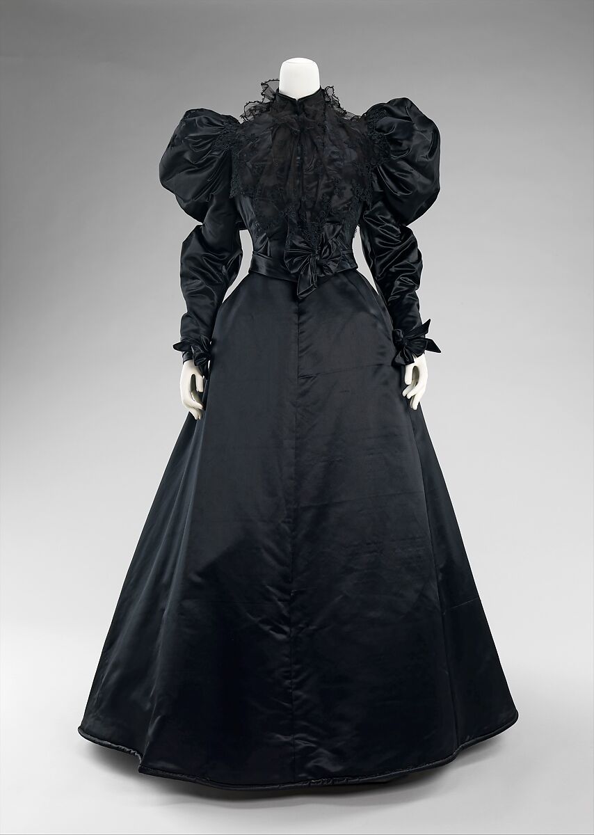 This is unusually simple in design yet elegant in its unbroken black satin. The dramatic shape is the quintessential style of the 1890s. This was made by a little known Brooklyn dressmaker.